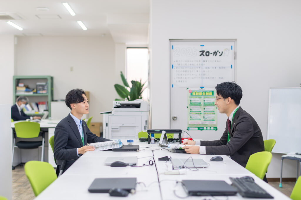 月東:同行しながら契約の説明の仕方や商品知識を教えるのですが、ただ伝えるだけでなく「今週はこれをやってみましょう」と具体的に課題を設け、そこに向けて取り組んでもらうようにしています。月毎の目標も立てて、月末にはその結果を所長と面談し、フィードバックをもらうなど、自身の成長を自分も周囲も確認しながら成長できる仕組みもあります。